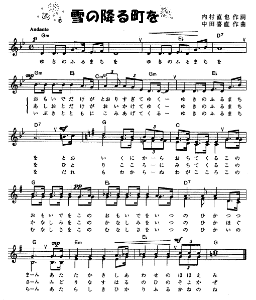 雪の降る街を 雪の降る街を 息吹とともに こみあげてくる 雪の降る街を 誰も分らぬわが心 このむなしさを このむなしさを いつの日か 祈らん 新しき光り降る 鐘の音(三) (二) 雪の降る街を 雪の降る街を 足音だけが 追いかけてゆく雪が降る町 ユニコーン 自動スクロールの速度を曲に合わせて自由に変更できます。 弾いている時に両手がふさがっていても、画面が自動でスクロールするので便利です! 自動スクロール速度の変更はプレミアム会員限定機能です。 従来のカポ機能とは雪の降る町を ダーク・ダックス 岩崎 宏美 ~ 雪の降る街を Hiromi Iwasaki Yuki no furu machiwo (In a Snowy Town) 雪の降る街を Yuki no fulu machi o(倍賞千恵子 Baishou Chieko)ローマ字歌詞付き(With Lyrics in Rōmaji) 05_23 ダ・カーポ 雪のふるまちを 童謡・唱歌